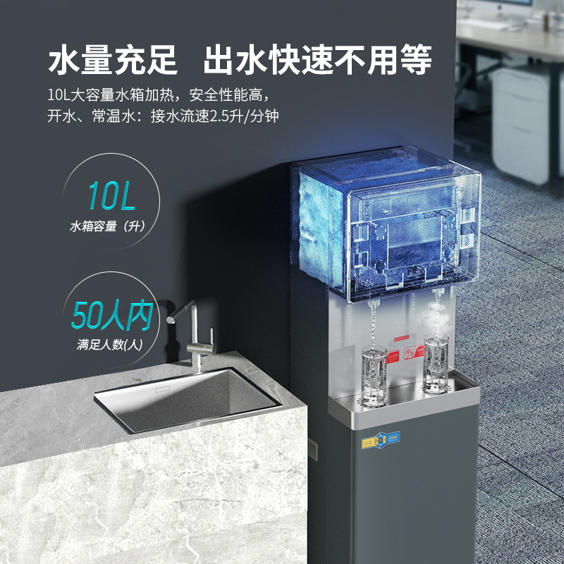 【产品货号】 FY-T1pro 【外形尺寸】 400*370*1420mm 【出水龙头】 一开水一常温水 【加热方式】 步进式 【出水模式】 触摸按钮取水 【箱体颜色】 轻奢灰 【热罐容量】 10L 【适用人数】 50人以内 【电源功率】 220V/1.5KW单相三线制 【制水能力】 开水16.5升/时、常温水24升/时 【可选可滤】 200加仑RO+3G压力桶 【特色功能】 IOT智能管理系统、综合滤芯管理、隔夜排空、童锁