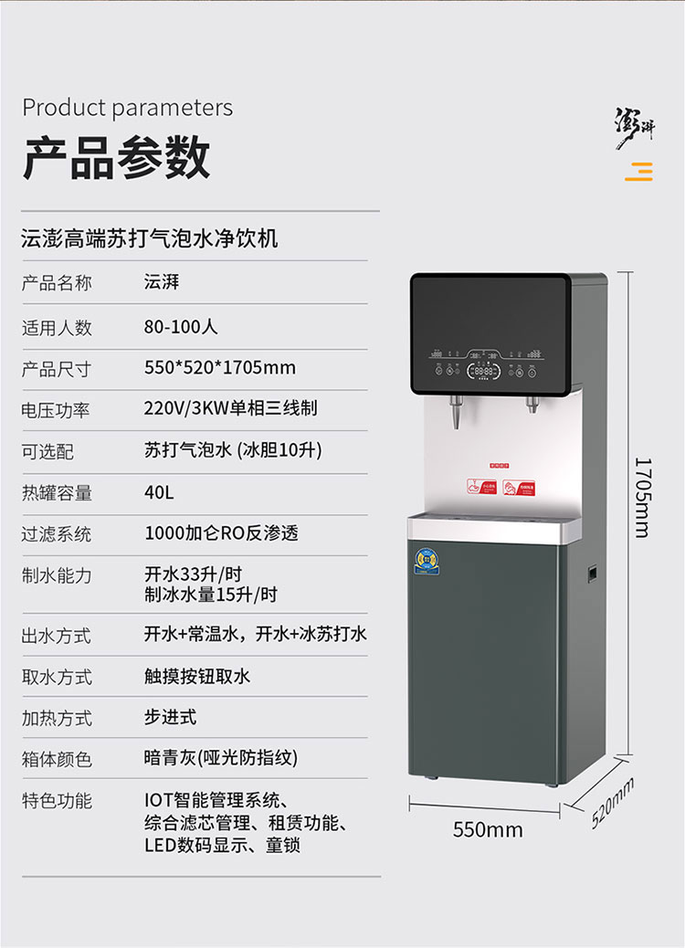 【产品名称】沄湃 【外形尺寸】 550*520*1705mm 【出水龙头】 开水+常温水 | 开水+冰苏打水 【 可 选 配 】 苏打气泡水(冰胆5升) 【出水模式】 触摸按钮取水 【箱体颜色】 暗青灰(哑光防指纹) 【热罐容量】 40L 【适用人数】 80-100人 【电源功率】 220V/3KW单相三线制 【制水能力】 开水33升/时、制冰水量15升/时 【可选可滤】 1000加仑RO 【特色功能】 IOT智能管理系统、综合滤芯管理、租赁功能、LED数码显示、童锁