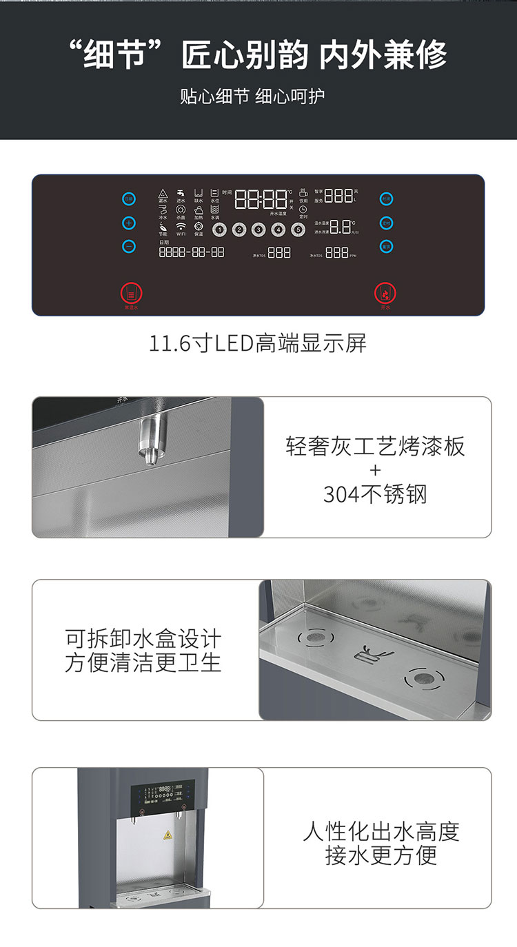 【产品型号】YX-A8RO 【适用人数】100人 【额定功率】3/6/9KW 【额定电压】220V/50HZ 【水胆容量】40L 【供水量】开水/30/60/90/130L/H 【出水龙头】一开一常温 【取水方式】触摸按键 【外形尺寸】600*460*1650MM注:不含机脚 【过滤】五级过滤(RO400+4G压力桶)