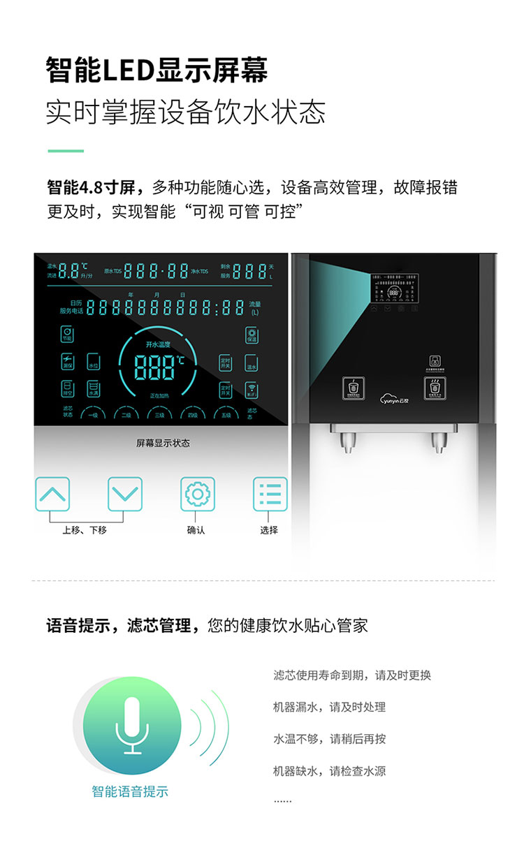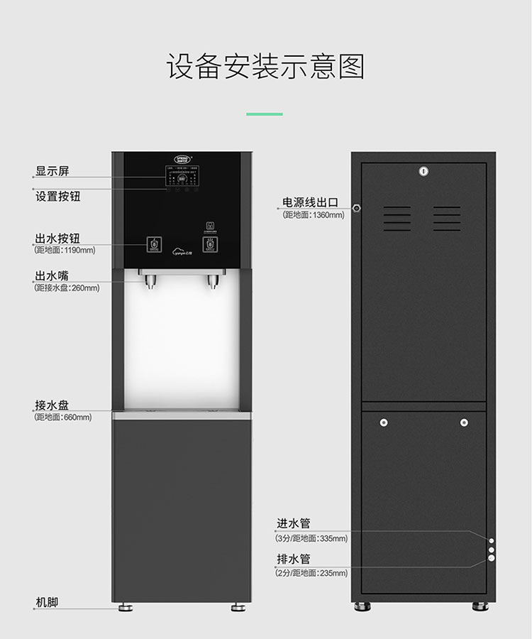 【可选颜色】哑黑 【适用人数】 80-150人 【出水龙头】 1开1常温 【水箱容量】 30L可选电压功率220V/3KW、380V/6KW、380V/9KW 【制水量开】 水33升/时、开水66升/时、开水99升/时 【外形尺寸】 450*480*1460mm 【取水方式】 触摸按钮取水 【可选配功】 能语音提示、隔夜排空、滤芯管理、智能远程监控