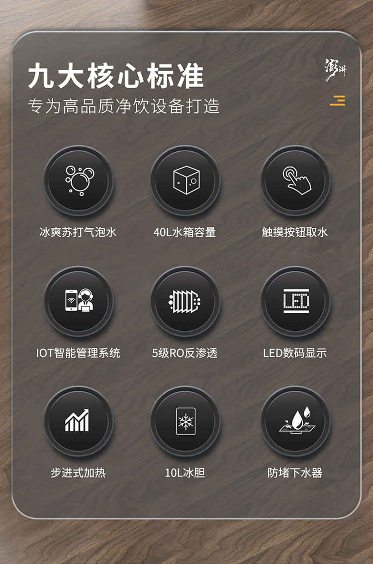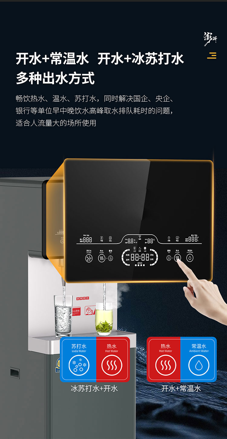 【产品名称】沄湃 【外形尺寸】 550*520*1705mm 【出水龙头】 开水+常温水 | 开水+冰苏打水 【 可 选 配 】 苏打气泡水(冰胆5升) 【出水模式】 触摸按钮取水 【箱体颜色】 暗青灰(哑光防指纹) 【热罐容量】 40L 【适用人数】 80-100人 【电源功率】 220V/3KW单相三线制 【制水能力】 开水33升/时、制冰水量15升/时 【可选可滤】 1000加仑RO 【特色功能】 IOT智能管理系统、综合滤芯管理、租赁功能、LED数码显示、童锁