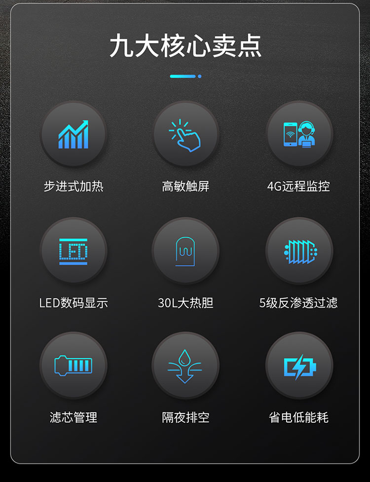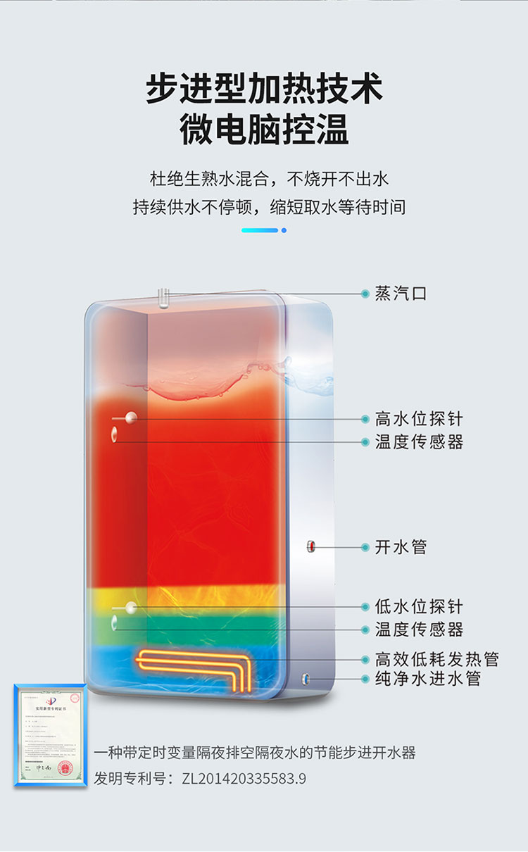 【产品货号】 FY-T2pro 【外形尺寸】 450*480*1500mm 【出水龙头】 一开水一常温水 【加热方式】 步进式 【出水模式】 触摸按钮取水 【箱体颜色】 轻奢灰 【热罐容量】 30L 【适用人数】 80-100人 【电源功率】 220V/3KW单相三线制 【制水能力】 开水33升/时、常温水63升/时 【可选可滤】 400加仑RO+3G压力桶 【特色功能】 IOT智能管理系统、综合滤芯管理、隔夜排空、童锁、定向脚轮